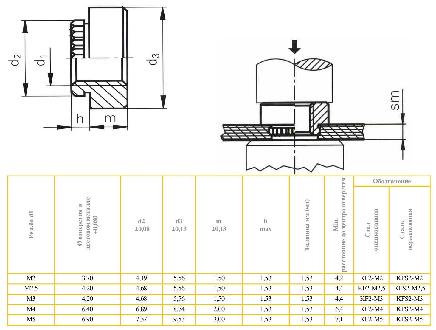 Запрессовочная гайка для печатных плат тип KFS2 из нержавеющей стали AISI 303. Имеет хорошую устойчивость к коррозии. Предназначена для монтажных отверстий без покрытия, т.к. при использовании в металлизированных монтажных отверстиях возникающие напряжения могут его повредить, полностью выдавить или сломать дорожки платы, соединенные с металлизированным отверстием. При установке в неметаллизированные монтажные отверстия в некоторых случаях могут возникнуть проблемы с расслоением, мизлингом или трещинами. Увеличение размера монтажного отверстия на +0,13–0,2 мм может решить эти проблемы. Запрессовочная гайка KFS2 может так же применяться для создания резьбовой точки крепления в заготовках из поликарбоната, акрила, стекловолокна, стеклопластика, алюминия. Размерность от М2 до М5. Предназначена для монтажа в материалы твердостью до HRB 70 и толщиной от 1,53 мм.