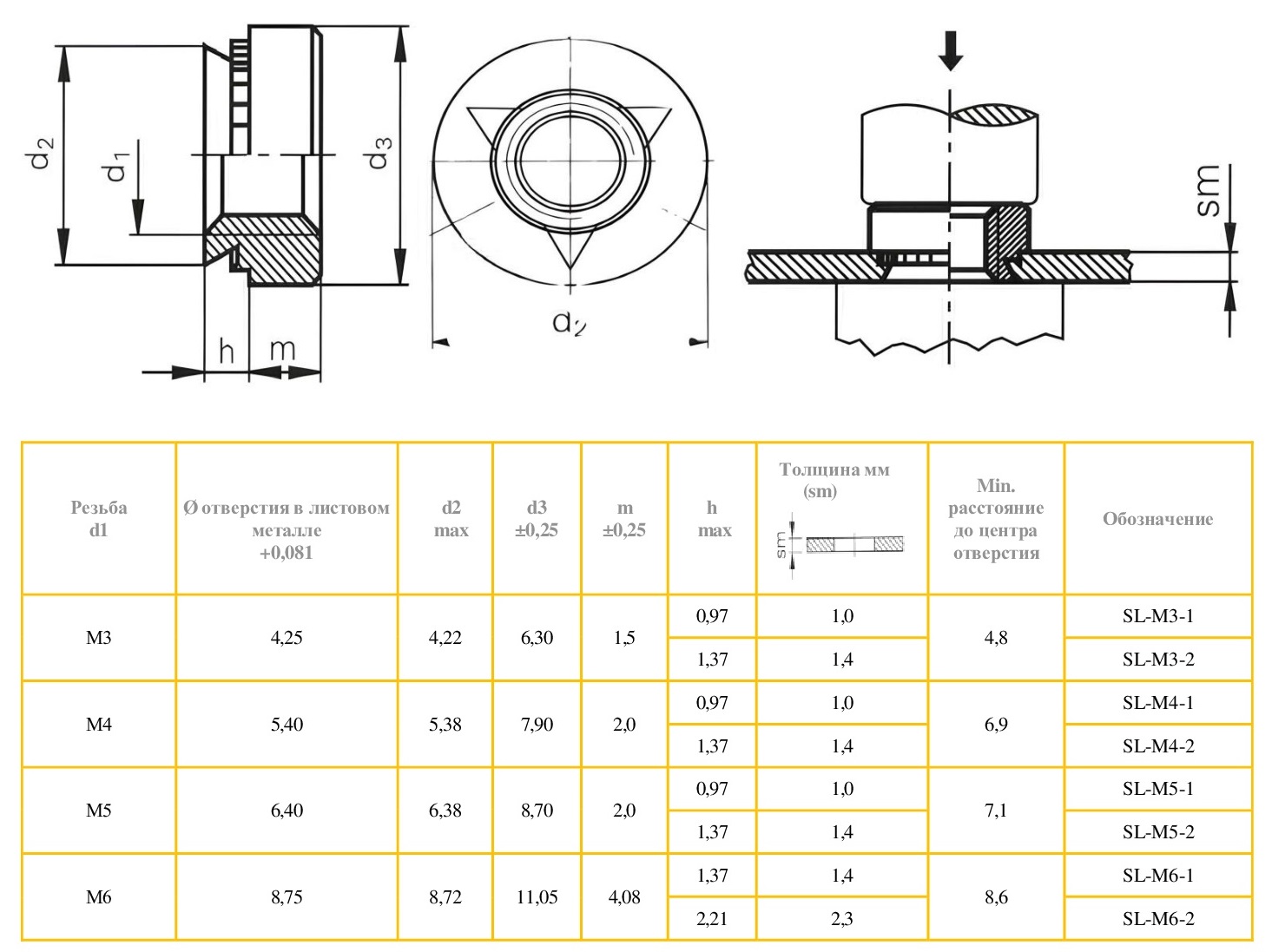 Стандартная самоконтрящаяся (самостопорящаяся) запрессовочная гайка тип SL из оцинкованной закаленной углеродистой стали. Оцинкованное покрытие продлевает срок службы гайки, повышая ее устойчивость к коррозии.  Соединения с применением гайки SL устойчивы к вибрационным нагрузкам и не ослабляются в процессе эксплуатации. Благодаря оригинальной конструкции обеспечивает увеличенную силу трения в резьбовой паре, полученную в результате деформации резьбового отверстия обжатием в трех точках в процессе монтажа.