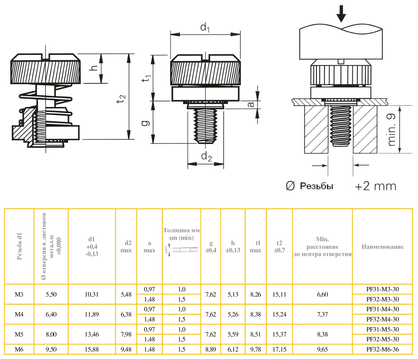 Запрессовочные винты применяются для создания резьбовой точки крепления в тонколистовом металле. Конструкция винта позволяет применять его как невыпадающий винт при монтаже крышек, панелей, плат. Малые габариты винта являются преимуществом при ограниченном пространстве около присоединяемой конструкции. Рифление на боковой поверхности головки винта позволяет уверенно вращать его руками, что значительно упрощает работу. При монтаже с помощью пресса (без удара) установочная часть винта полностью утапливается в листовой материал с обратной стороны. Деформируемый металл, при этом, затекает в кольцевую канавку на корпусе винта, что обеспечивает надёжную фиксацию в листовом металле. Подходят для крепления металлических панелей или других компонентов из тонких материалов в тех случаях, когда потребуется последующий доступ. Подпружиненный, невыпадающий винт для монтажа и демонтажа панелей, крышек, электронных плат и др. Разработан для минимальной толщины металла от 1,0 мм. Применение: для установки в металл твердостью до HRB 60