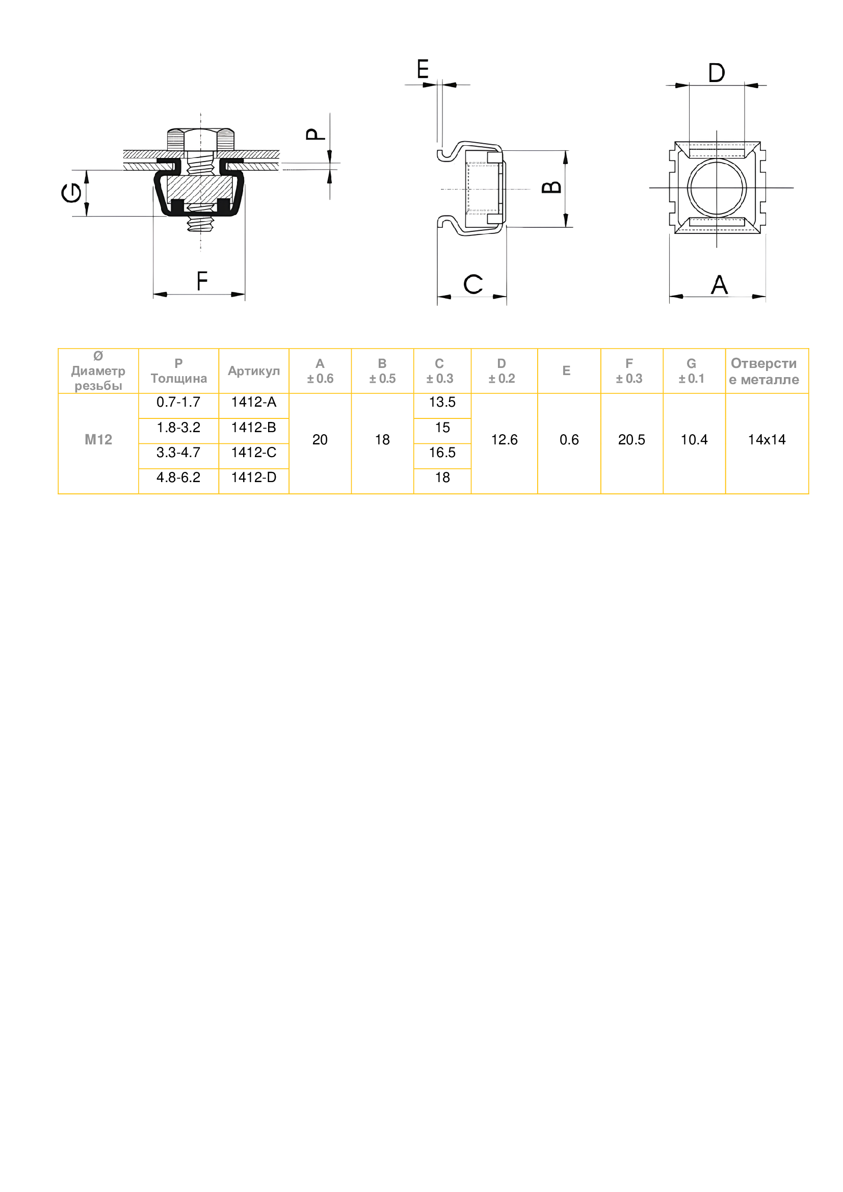 Гайка закладная М12 SMG 1412-B, квадрат 14,0 мм, для установки в металл толщиной 1,8 - 3,2 мм