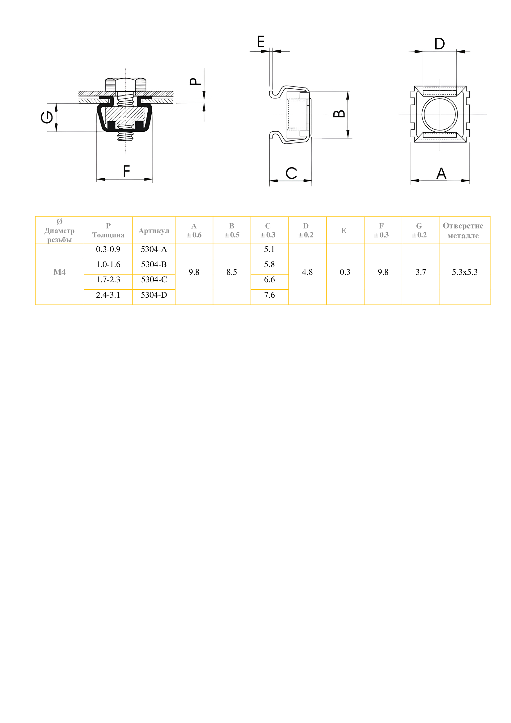 Гайка закладная M4 534 D B отверстие в металле 5,3х5,3 мм, толщина 2,4-3,1 мм