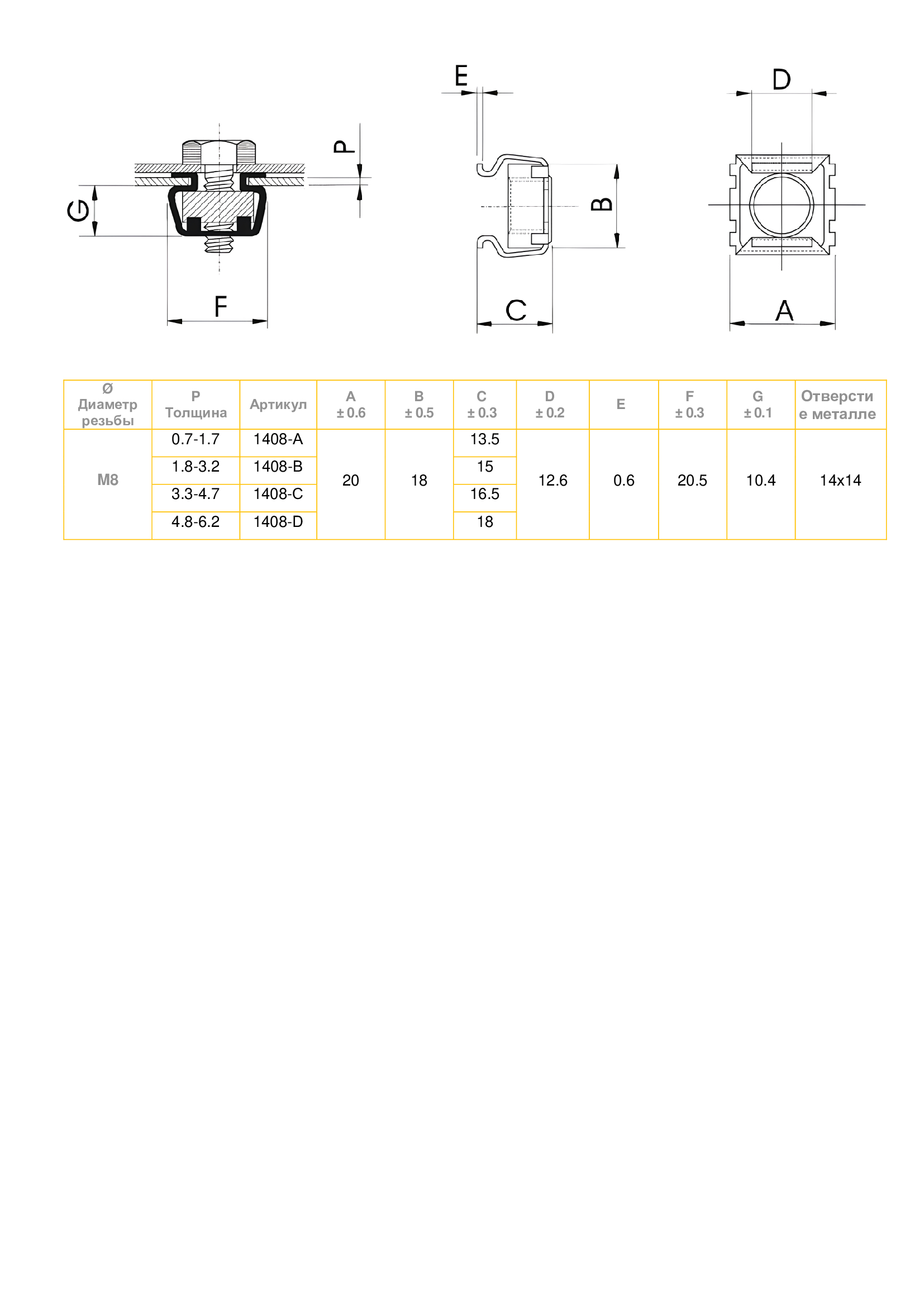 Гайка закладная М8 SMG 1408-С, квадрат 14,0 мм, для установки в металл толщиной 3,3 - 4,7 мм