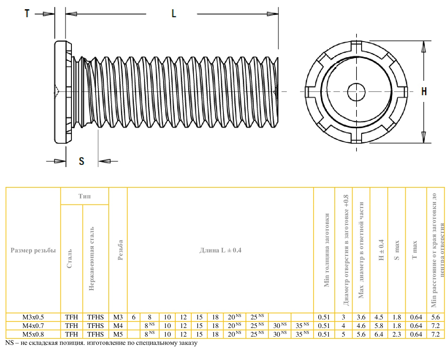 TFH (не «заподлицо») шпильки предназначены для установки в заготовки толщиной 0,51 мм. Также эти шпильки могут устанавливаться в заготовки с небольшой толщиной металла, если не требуется устанавливать шпильки «заподлицо». TFH шпильки устанавливаются в заготовку также как и шпильки FH, однако, для этого требуется использовать другие установочные пуансон и матрицу. TFH шпильки надежно устанавливаются в заготовке с достаточно высоким сопротивлением осевой нагрузке и провороту. Головка шпильки будет не «заподлицо» с поверхностью заготовки и будет выступать над заготовкой примерно на 0,64 мм