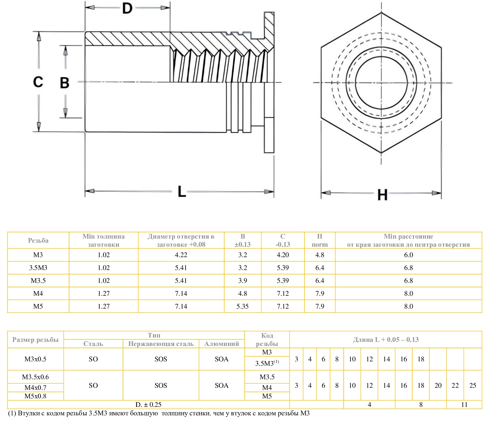 Втулки запрессовочные с шестигранным основанием и сквозной резьбой из алюминия, используются для материалов твёрдостью до HB 95.